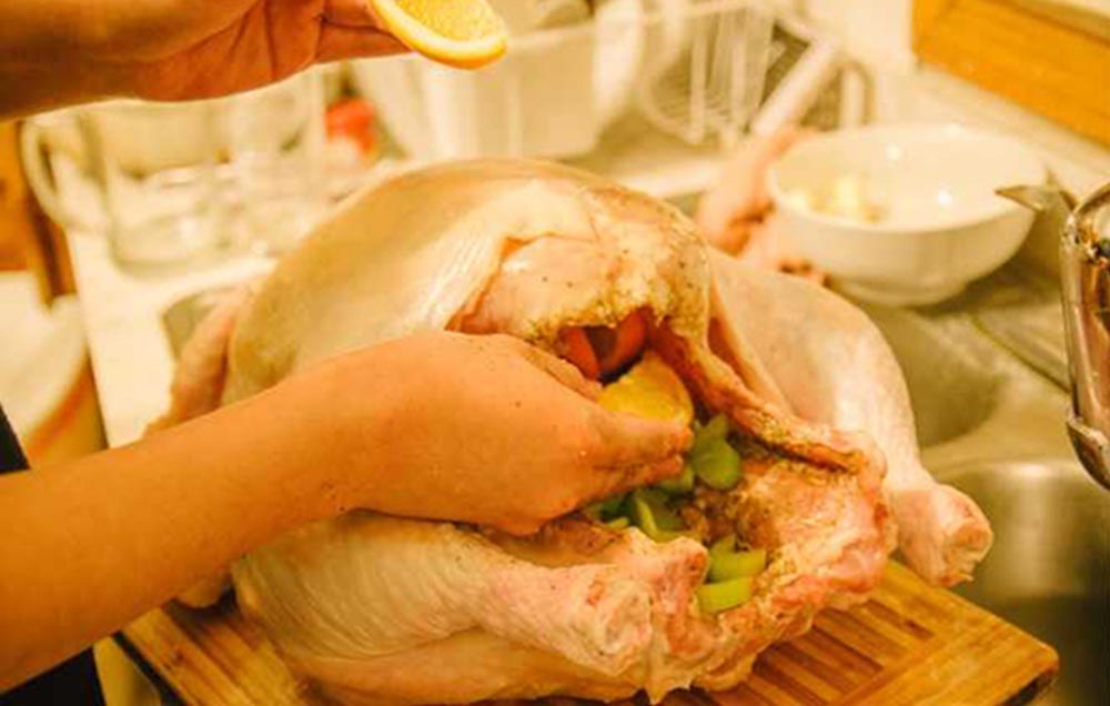 10、从火鸡肚子处填入所有料,要塞的紧紧的满满的。